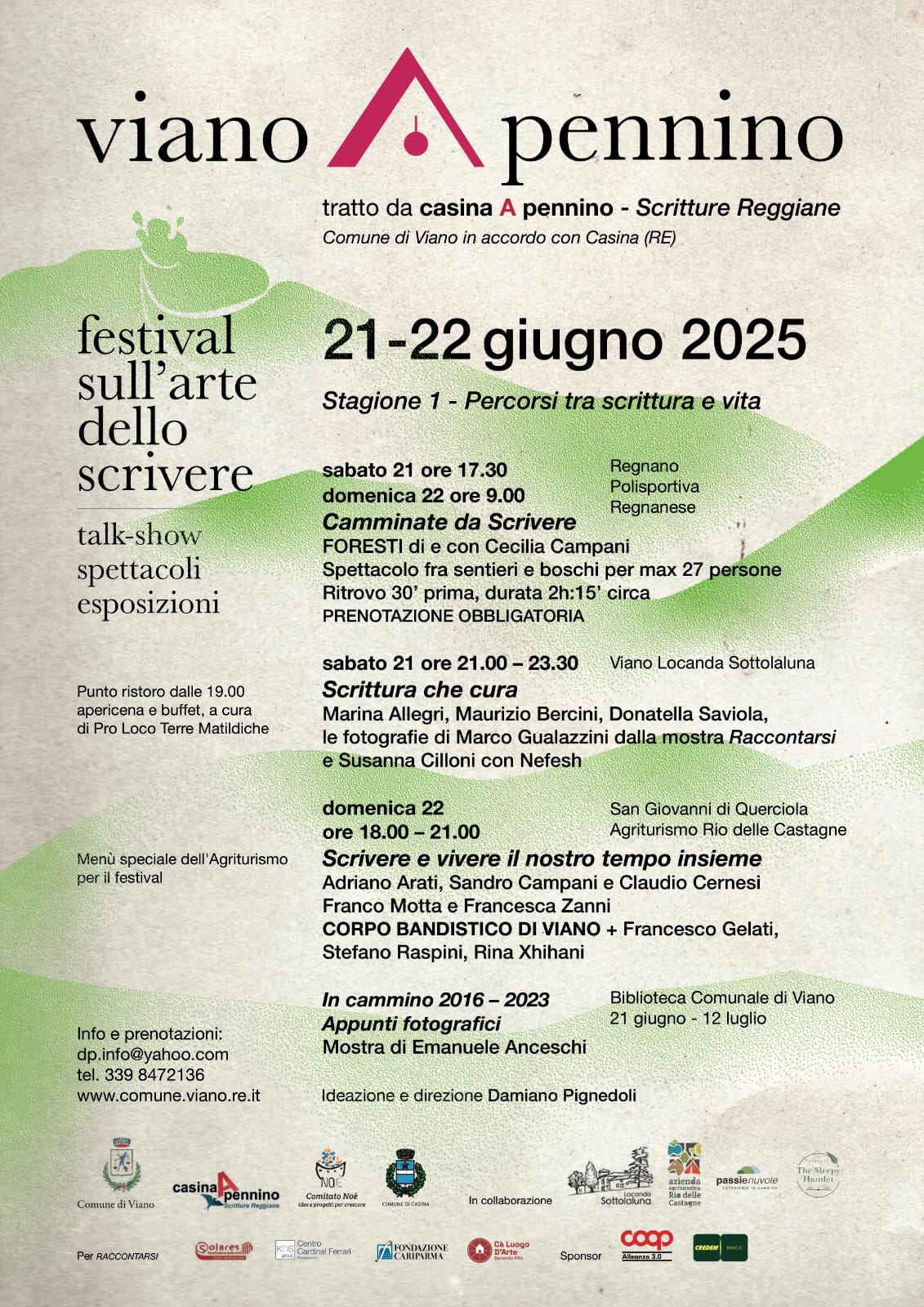 Il 21-22 giugno, esordisce a Viano (Reggio Emilia) un weekend di talk-show, performance poetiche, esposizioni e spettacoli che è un felice sconfinamento del festival sulle Scritture Reggiane nato a Casina (dove tornerà dal 5 al 7 settembre 2025).