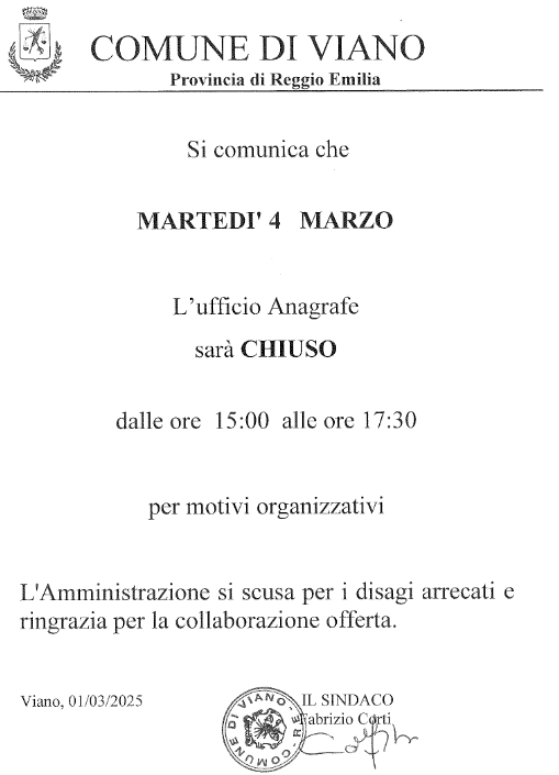 Martedi' 04/03/2025 l'ufficio anagrafe rimmarra' chiuso dalle 15.00 alle 17.30 per motivi organizzativi.
