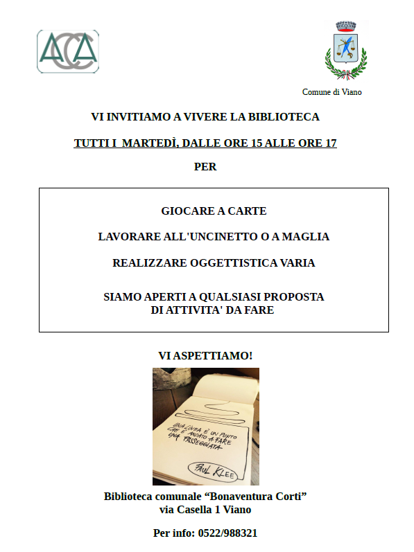 VI ASPETTIAMO presso la Biblioteca comunale “Bonaventura Corti” via Casella 1 Viano