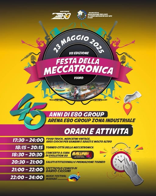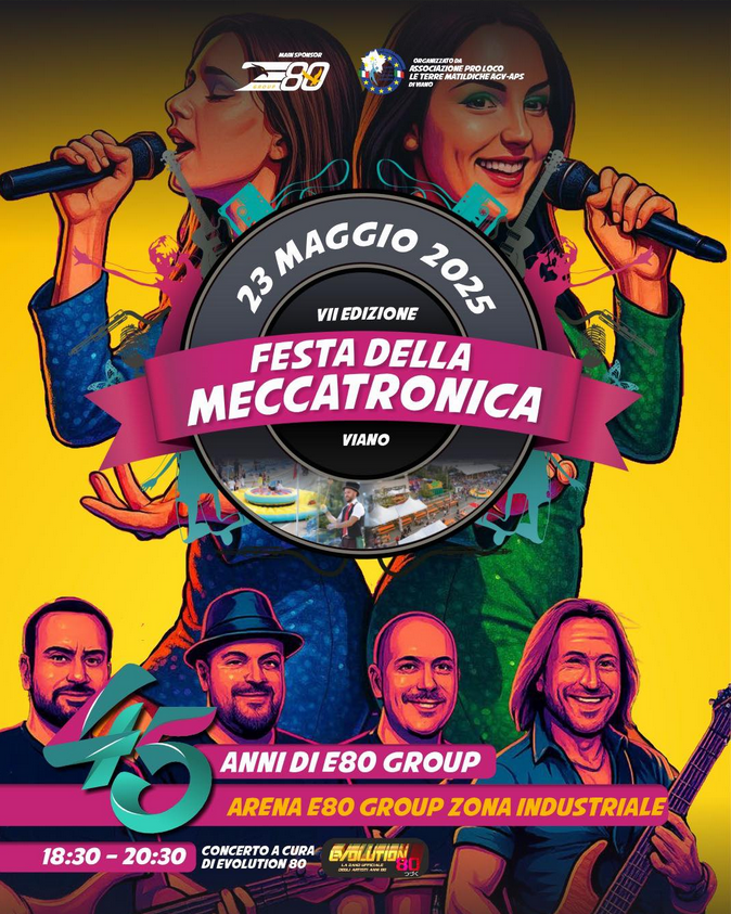 VII edizione della Festa della Meccatronica promossa dall'associazione Pro Loco Le Terre Matildiche AGV-APS di Viano e sostenuta da E80 Group che nell'occasione festeggia i 45 anni di attivita'